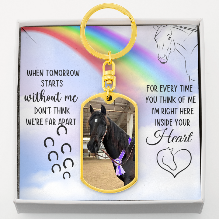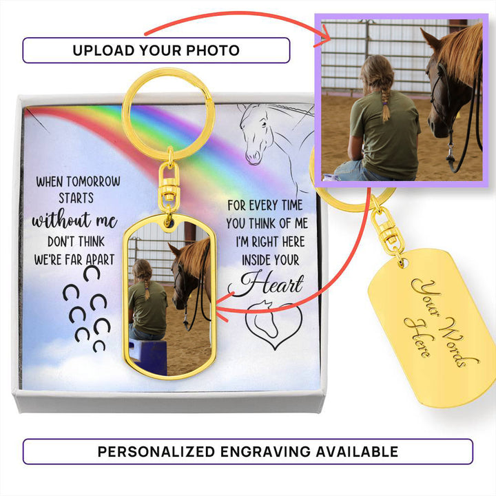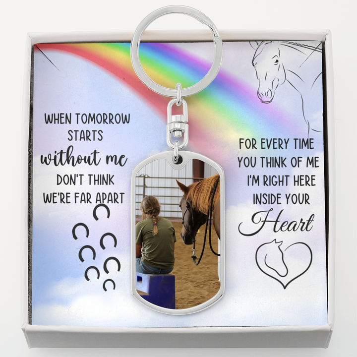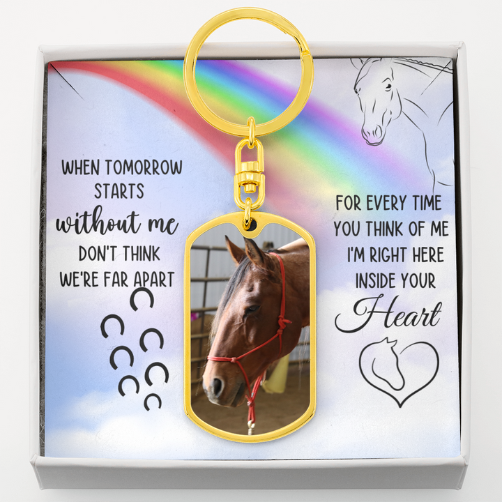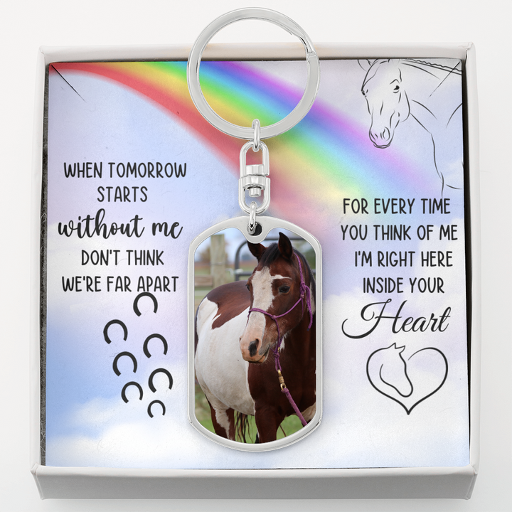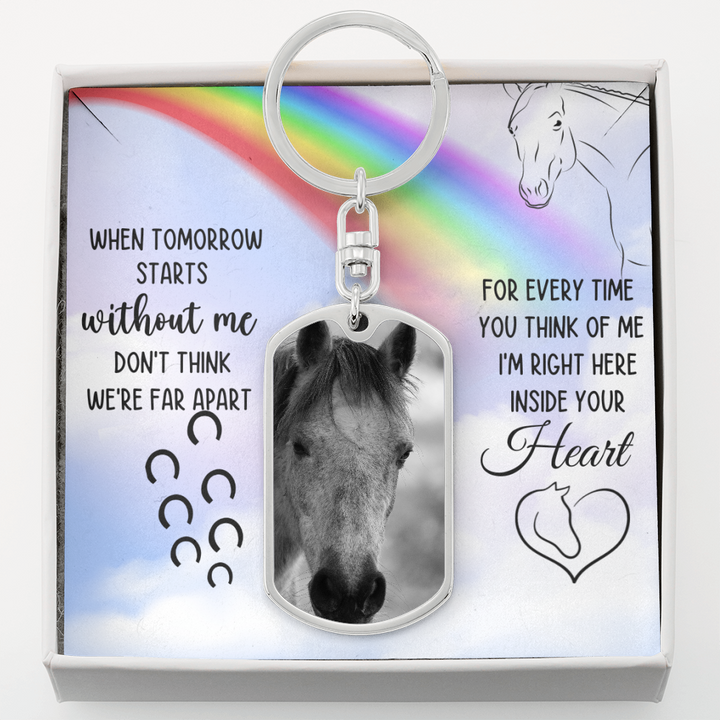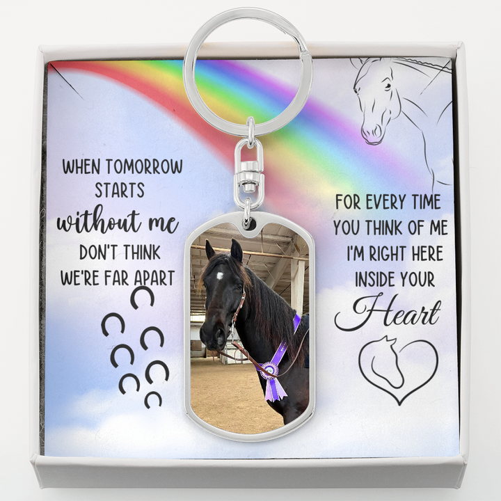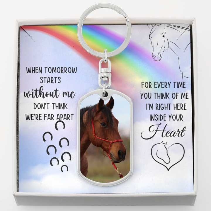 Carry a piece of your heart everywhere you go with our Horse Memorial Key Chain. This personalized keepsake connects you with the cherished memories of your beloved equine friend. Crafted with love, each key chain comes with a customizable picture that can be adorned with your most treasured horse's picture, ensuring you feel their presence in every moment.